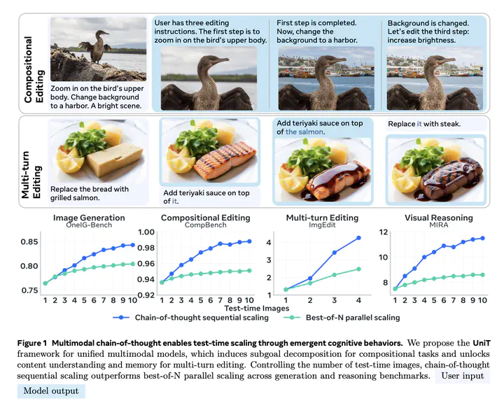 Unified models can handle both multimodal understanding and generation within a single architecture, yet they typically operate in a single pass without iteratively refining their outputs. Many multimodal tasks, especially those involving complex spatial compositions, multiple interacting objects, or evolving instructions, require decomposing instructions, verifying intermediate results, and making iterative corrections. While test-time scaling has demonstrated that allocating additional inference compute for iterative reasoning substantially improves language model performance, extending this paradigm to unified multimodal models remains an open challenge. We introduce UniT, a framework for multimodal chain-of-thought test-time scaling that enables a single unified model to reason, verify, and refine across multiple rounds. UniT combines agentic data synthesis, unified model training, and flexible test-time inference to elicit cognitive behaviors including verification, subgoal decomposition, and content memory. Our key findings are unified models trained on short reasoning trajectories generalize to longer inference chains at test time, sequential chain-of-thought reasoning provides a more scalable and compute-efficient TTS strategy than parallel sampling, training on generation and editing trajectories improves out-of-distribution visual reasoning. These results establish multimodal test-time scaling as an effective paradigm for advancing both generation and understanding in unified models.